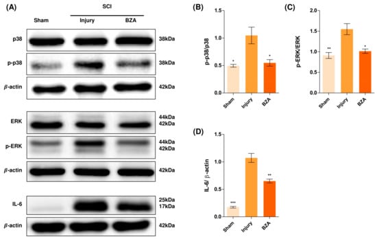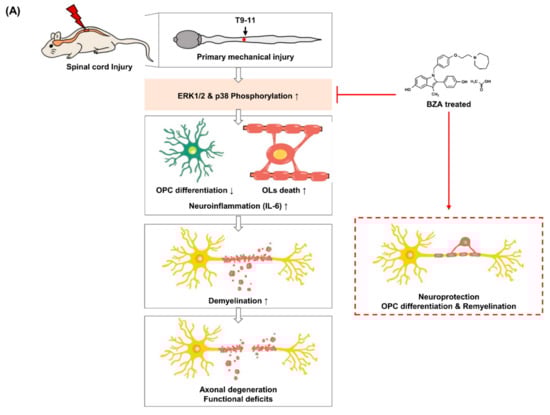 2.5. BZA Downregulates the Phosphorylation of ERK and p38 Pathways Induced by SCI