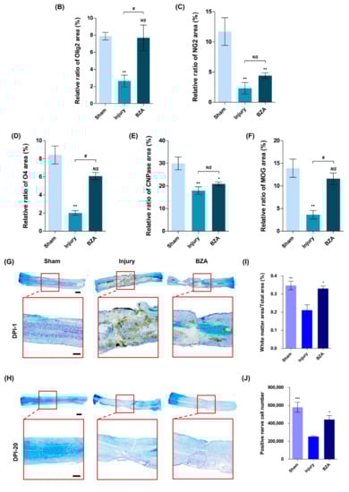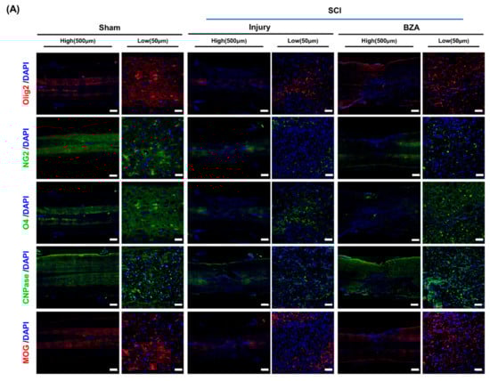 2.6. BZA Enhances OPC Differentiation and Remyelination after SCI in Rats
