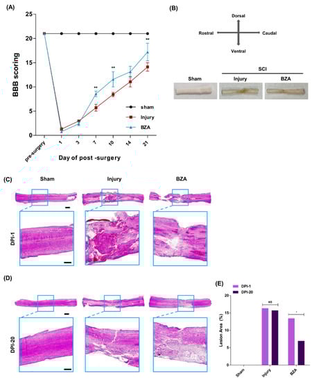 2.7. BZA Reduces Lesion Volume and Improves Functional Recovery following SCI