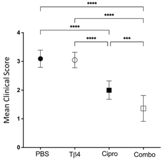 Firstly, clinical scores were recorded to assess the disease response at 3 days post-infection (p.i.), as shown in Figure 1. Mean clinical scores were similar between Tβ4-treated mice and PBS controls. Disease response was significantly improved in ciprofloxacin-treated corneas when compared to both PBS controls and Tβ4-treated mice. However, the Tβ4 + ciprofloxacin-treated animals exhibited the lowest clinical scores and the most improved disease outcome, with excellent resolution of corneal opacity at 3 days p.i.