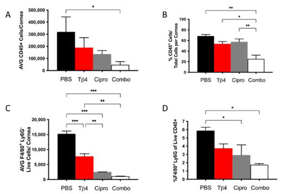 Flow cytometry results of inflammatory cellular infiltrates following infection. CD45+ leukocytes (A,B) and CD45+F4/80+Ly6G− MΦ (C,D) as determined by flow cytometry at 3 days p.i. in corneas of PBS-, Tβ4-, cipro-, and combo-treated B6 mice. Results are shown as averages of single cell populations (A,C), % of leukocytes per total cells per cornea (B), or % of live MΦ per total population of live leukocytes (D). n = 5 corneas/group; * p < 0.05, ** p < 0.01, *** p < 0.001.