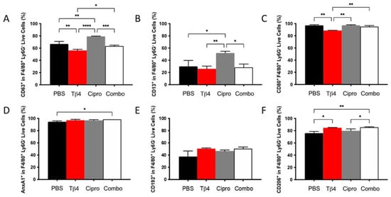 To next examine whether there were any phenotypic differences in the MΦ populations detected in each treatment group, select cell surface molecules that are considered either pro-inflammatory or anti-inflammatory in nature were detected using flow cytometry. As presented in Figure 3, the % of cells expressing the three pro-inflammatory cell surface markers, CD63 (A), CD13 (B), and CD80 (C) within the MΦ subpopulation, were similar between adjunctive Tβ4-treated groups and PBS controls. CD63 and CD80, however, were significantly reduced in Tβ4 only compared to PBS controls. Surprisingly, ciprofloxacin alone significantly enhanced the expression of CD63 and CD13, whereas CD80 remained unchanged. Regarding the three anti-inflammatory surface markers, annexin A1 (AnxA1) (D), CD192 (E), and CD206 (F), significant increases were observed for AnxA1 and CD206 in the combination group only and CD206 in Tβ4 alone. Furthermore, the increased expression of CD206 in the combination group was significant compared to both PBS control and ciprofloxacin groups (p < 0.05). No differences were detected between ciprofloxacin and PBS. These results together reflect that Tβ4 influences the activation state of MΦ in the corneas of P. aeruginosa-infected B6 mice, where decreased pro-inflammatory markers paired with increased anti-inflammatory markers within the MΦ subpopulation in the adjunctive treatment group enhanced the resolution of the host inflammatory response.