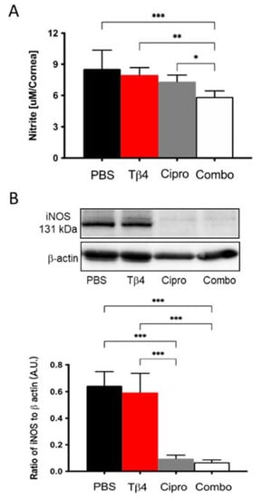NO levels were measured to investigate the mechanism(s) by which Tβ4 may influence MΦ cellular function. It is well-known that MΦ produce free radicals, mainly NO, one of the key mediators in response to inflammation [29]. As an indicator of MΦ activation, nitrite (a stable oxidized product of NO) was measured at 3 days p.i. (Figure 4A). Corneas from adjunctive Tβ4-treated mice exhibited significantly decreased nitrite levels compared to PBS control, Tβ4 alone, and ciprofloxacin only treatment groups. NO is produced when arginine is converted into citrulline by nitric oxide synthases (NOS). iNOS is primarily found in MΦ and is expressed maximally after an inflammatory stimulus [29]. Based on this, iNOS levels were detected at the protein level by Western blot (Figure 4B). The results indicate that both ciprofloxacin and adjunctive Tβ4 treatment significantly inhibit iNOS levels when compared to PBS control and Tβ4 only treatment. iNOS was similar between Tβ4 alone and PBS control groups. Combined with the results obtained by flow cytometry, these data further illustrate that in addition to decreasing infiltrated MΦ infiltration, cell numbers, and activation state, MΦ cellular function was inhibited by the adjunctive Tβ4 treatment.
