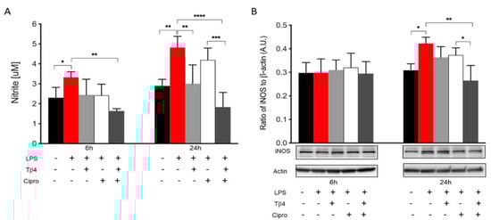 In the infected cornea, many different cell types function together in response to the invading pathogen. In vitro studies were carried out to complement the in vivo work regarding how Tβ4 may be influencing MΦ activation and function without the confounding factors of other inflammatory cells or the bacteria. Two time points (6 and 24 h) were assessed to evaluate the effect of Tβ4 on LPS-induced NO production and iNOS levels using RAW 264.7 cells (Figure 5). After 6 h of LPS stimulation, nitrite levels (A) were significantly elevated compared to media only. Tβ4 and ciprofloxacin groups remained comparable to controls, while the adjunctive Tβ4 treatment significantly decreased LPS-induced NO levels. At 24 h after LPS stimulation, NO production was significantly downregulated in the Tβ4 and adjunctive Tβ4 treatment groups, while no differences were observed after ciprofloxacin alone treatment. From 6 to 24 h, the results indicated that NO generation was increasing in MΦ exposed to LPS, but that Tβ4 also began to exert its function in both Tβ4 alone and adjunctive groups. The critical enzyme iNOS, responsible for NO generation from MΦ, was also detected at both time points (B). iNOS was expressed without differences among all groups at 6 h after treatment. However, at 24 h, there was a significant upregulation of iNOS following LPS stimulation compared to media only. Notably, adjunctive Tβ4 treatment significantly inhibited LPS-induced iNOS expression by MΦ. These results reveal that Tβ4 treatment—either alone or as an adjunct—effectively inhibits RNS generation by MΦ.