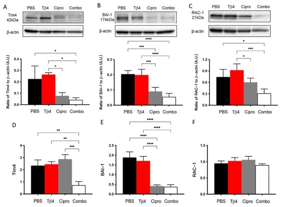 MΦ engulfment of apoptotic PMN has been demonstrated as an essential event in the resolution of inflammation [30,31]. To further investigate the underlying mechanism(s) behind the improved disease response observed in the adjunctive Tβ4 treatment group, protein levels for select molecules known to be involved in MΦ efferocytosis were detected [30,31]: two cell surface receptors, Tim4 and BAI-1, and the signaling molecule RAC-1 (Figure 6). The results indicate that protein levels of Tim4, BAI-1, and RAC-1 were all significantly inhibited in the combination group, with no differences detected between Tβ4 alone and PBS control groups. It was also noted that ciprofloxacin only treatment significantly downregulated BAI-1 compared to the PBS group. mRNA levels were also determined to confirm whether these changes were also occurring at the transcriptional level. Tim4 (D) and BAI-1 (E) transcripts were significantly downregulated in the combination-treated corneas compared to PBS controls. No differences were observed between groups for RAC-1 (F) mRNA expression. Further, ciprofloxacin treatment was shown to significantly reduce mRNA levels of BAI-1 only, despite reduced protein levels for all three molecules.
