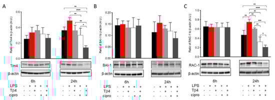 The efferocytotic activity of MΦ was also analyzed in vitro to further confirm the regulatory influence of adjunctive Tβ4 treatment on MΦ cellular function in response to LPS stimulation. Levels of Tim4 (A), BAI-1 (B), and Rac-1 (C) in LPS-stimulated MΦ were detected after 6 and 24 h, as shown in Figure 7. The results revealed that Tim4 (A) expression was comparable among groups at 6 h. However, at 24 h, ciprofloxacin treatment significantly decreased LPS-induced Tim4 levels. More remarkably, adjunctive Tβ4 treatment significantly decreased LPS-induced Tim4 production when compared to all four groups. Similarly, BAI-1 (B) was uniformly expressed between all groups at 6 h after LPS stimulation. Despite trending upward after LPS stimulation and downward with the adjunctive treatment, no statistically significant differences were observed after 24 h. The signaling molecule, Rac-1 (C), was evenly expressed among all groups at 6 h. However, it was significantly increased after LPS stimulation at 24 h. LPS-induced levels of Rac1 were significantly reduced following Tβ4 alone and ciprofloxacin alone treatments, while the combination group resulted in a significant decrease in Rac1 when compared to all treatment groups. Together, these in vivo and in vitro data confirm that both Tβ4 and ciprofloxacin suppress efferocytotic functions of the MΦ.
