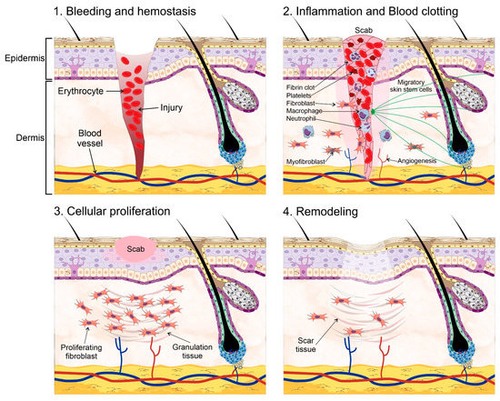 Wound healing process. Wound healing and skin regeneration. Wound healing is a highly conserved mechanism that includes processes such as: (1) bleeding and hemostasis, in which blood flow slows and a clot forms to prevent blood loss during an injury. (2) Inflammation and blood clotting, in which the wound becomes sealed by fibrin which forms a temporary matrix occupied by immune cells whose task is to remove dead tissue and control infection, fibroblasts are then recruited into the site of the injury and promote angiogenesis and the recruitment of fibroblast-derived myofibroblasts, which contract the wound area. Skin stem cells are mobilized into the site of injury at this stage to begin the process of re-epithelialization starting from the edge of the wound. (3) Cellular proliferation, in which the recruited fibroblasts secrete collagen, and form granulation tissue, a scab is formed on the site of injury. (4) Extracellular matrix (ECM) remodeling, in which new ECM components are secreted by both fibroblasts and epidermal keratinocytes, which remodel the matrix through the expression of matrix metalloproteinases. Some elements of this figure were taken from the Mind the Graph platform, available at www.mindthegraph.com (accessed on 27 September 2021).