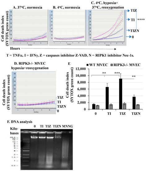 In vitro simulating IRI promotes necroptosis in MVECs. MVECs from wild-type (WT) B6 mice (A–C) or RIPK3−/− mice (D) were seeded in a 96-well plate in triplicate. The cell culture plate was subjected to hypoxia for 24 h in anaerobic GENbags at 4 °C followed by normal cell culture conditions at 37 °C with 20% O2 and 5% CO2. TNFα (T) at 50 ng/mL, IFNγ (I) at 50 ng/mL, z-VAD-fmk (Z) at 30 μM and Nec-1s (N) at 10 μM were added. SYTOX green at 100 nM was used as a nuclear counterstain to indicate dead cells. Cell death was detected and quantified in the IncuCyte Live Cell Image System. (E) Data at 24 h post-reoxygenation are shown as the mean ± standard deviation (SD) and represent at least 3 independent experiments. ** p ≤ 0.01, *** p ≤ 0.001 and **** p ≤ 0.0001, 1-way ANOVA and Tukey’s multiple comparisons test. (F) DNA degradation analysis. MVECs were seeded in 6-well plates and subjected to the in vitro IRI treatment as above. DNA was isolated, and an equal amount of DNA (2 μg) was loaded onto 0.8% agarose gel for electrophoresis. MNNG (15 μM) was used as a positive control to induce DNA degradation. The same experiment was repeated three times, and similar results were obtained.