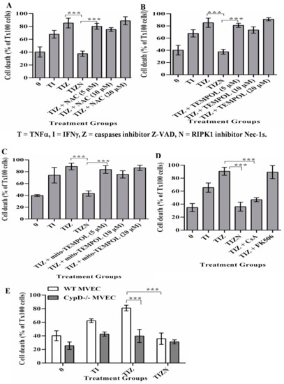 CypD, not ROS, contributes to MVEC necroptosis under the in vitro simulation of IRI conditions. (A–C). MVECs were subjected to cold hypoxia-reoxygenation with cytokines, as described in Figure 1. ROS scavenger NAC, TEMPOL or Mito-TEMPOL were added, respectively. A small amount of (0.1%) Triton X-100 (Tx100) was used to induce maximum death with 100% cell staining of SYTOX green. % EC death = sample count/count of Triton-X100-treated cells. Data are shown at 24 h post-reoxygenation as the mean ± SD of triplicates and representative of at least 3 independent experiments. (D) CypD inhibitor—CsA and control FK506 at 10 μM was added before hypoxia. Data are shown as the mean ± SD and representative of at least 3 independent experiments. (E) Wild-type (WT) and CypD−/− MVECs were subjected to in vitro cold hypoxia-reoxygenation with cytokines, as in Figure 1. Data are shown as the mean ± SD and representative of at least 3 independent experiments. *** p ≤ 0.001; 1-way ANOVA and Tukey’s multiple comparisons test.