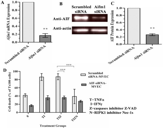 To study the role of AIF in necroptosis, AIF expression was silenced in MVECs using siRNA. AIF silencing was confirmed by PCR (Figure 3A) and Western blot (Figure 3B,C). AIF-silenced endothelial cells were subjected to the in vitro simulation of IRI treatment. Compared to scrambled siRNA-transfected cells, AIF-silenced cells showed a significant reduction in cell death (Figure 3D). This finding indicates that AIF has a critical role in the necroptotic pathway.