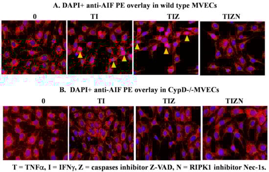 AIF translocation to the nucleus in necroptotic MVECs. Wild-type B6 MVECs (A) and CypD−/− MVECs (B) were subjected to the in vitro IRI treatment, as above. The MVECs were fixed with 4% formaldehyde solution after 24 h of reoxygenation and permeabilized with 0.1% Triton X-100. The cells were incubated with antimurine AIF antibody, followed by anti-rabbit PE-conjugated antibody. The nucleus was stained with 300-nM DAPI. Nuclear AIF staining (pink color) is pointed to by arrows. Images were captured under 200 times magnification under fluorescent microscopy. The same experiment was repeated at least 3 times. Representative cell images are shown.