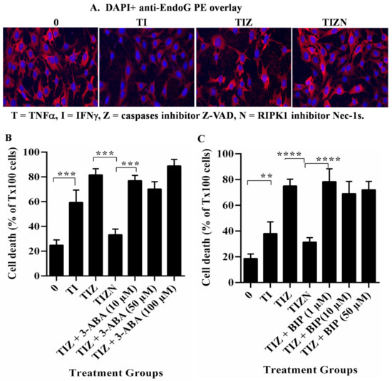 AIF itself does not have nuclease function but, rather, facilitates DNA cleavage via endonuclease G (EndoG) [45,46,47,48]. However, we did not observe the nuclear translocation of EndoG (Figure 5A). An early study demonstrated that the translocation of AIF requires the activation of poly(ADP-ribose) polymerase 1 (PARP-1) during cell death [49]. AIF translocation can be prevented by PARP inhibitors or the genetic deletion of PARP-1 [49]. However, in our study, MVEC necroptosis could not be inhibited with the addition of PARP-1inhibitor 3-aminobanzamide (3-ABA, Figure 5B). Other studies showed that Bcl-2-associated X (BAX) or the Bcl-2 Homology 3-interacting domain death agonist (BID) are required for AIF release [50,51,52]. However, in our study, adding BAX-inhibiting peptide V5 (BIP) did not prevent necroptosis (Figure 5C). These data imply that the function of AIF in necroptosis is associated with other molecule(s).