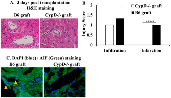 Firstly, we wanted to examine whether CypD deficiency in a donor graft could prevent IRI in cardiac transplant. Donor hearts from wild-type and CypD−/− B6 mice were subjected to ischemic storage at 4 °C for 4 h and then transplanted into allogeneic BALB/c mice. Grafts (n = 4/group) were collected 3 days after transplantation for the pathology analysis. Double-blinded histological scores showed significant graft damage in the wild-type allografts compared with the CypD−/− allografts (Figure 6A,B). Next, we analyzed AIF in the graft. Interestingly, the colocalization of AIF with the nucleus was found in the wild-type graft, not in the CypD−/− graft (Figure 6C). Hence, these data indicate that CypD deficiency prevents graft IRI and the nuclear translocation of AIF.