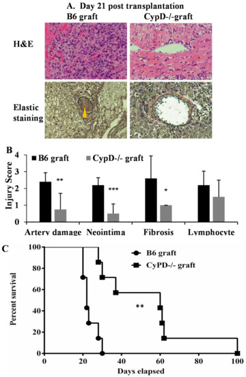 To determine if CypD deficiency in donor cardiac grafts can attenuate a transplant injury long term, wild-type B6 or CypD−/− hearts (n = 4/group) were subjected to ischemic storage as above and transplanted into BALB/c mice followed by a brief immunosuppression with sirolimus (rapamycin, days −1 to 9). The grafts were collected 21 days after the for pathological analysis. Double-blinded histological evaluation indicated significant damage to the microvasculature (Hematoxylin & Eosin (H&E) staining), with high levels of neointima formation and fibrosis (elastic stain) in the wild-type allografts (Figure 7A,B). Allograft injury was significantly decreased in the CypD−/− allografts.