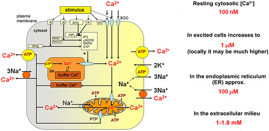 Calcium ions play a universal and versatile role in all cells and, in fact, it would be difficult to find a completely calcium-independent cellular process [40]. Quiescent, healthy cells, electrically excitable as well as non-excitable ones, maintain the bulk cytosolic calcium ions concentration ([Ca2+]c) at the level of 100–120 nM, while extracellular [Ca2+] level is approximately 1.0–1.8 mM [41,42,43].