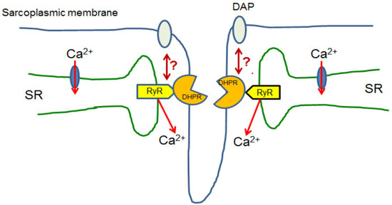 While calcium channel blockers have little impact on the DMD pathology [64], the mechanisms downstream from the channel entry seem to affect the calcium response that directly controls the excitation-contraction coupling. Whereas expression of mini-dystrophin in mdx muscle restored Ca2+ entry through channels [51], mass spec analysis of dystrophin and DAP in sarcoplasmic membrane compartments failed to confirm a direct interaction of dystrophin with the triad complex [45]. Therefore, alternatively, dystrophin and DAP may modulate the interaction between L-type Ca2+ channels and RyR [51,65].