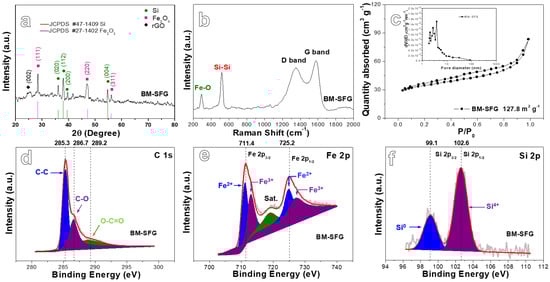 (a) X-ray diffraction (XRD) pattern of the BM-SFG; (b) Raman spectrum of the BM-SFG; (c) N2 adsorption-desorption isotherm characteristics and pore size distribution (inset) and high-resolution XPS spectra of (d) C 1s, (e) Fe 2p, and (f) Si 2p for the BM-SFG.