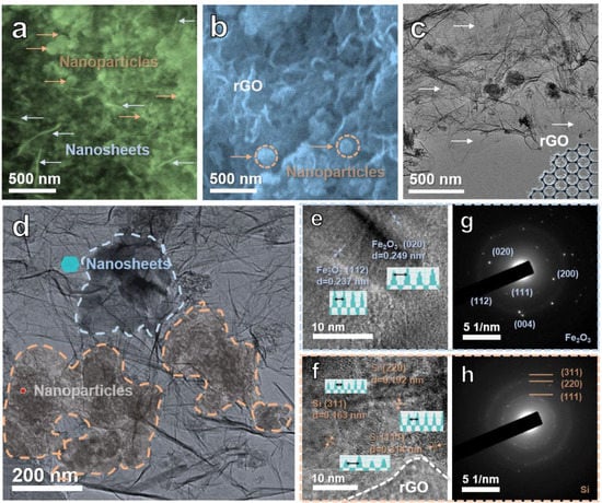 TEM images (Figure 2c,d) show that the Fe2O3 nanosheets and Si nanoparticles are uniformly anchored on rGO networks. In this situation, the three materials contact each other in pairs, ensuring the continuity of the conductive channel and the high conductivity of the composites conducive to improving the electrochemical performance of LIBs. The HRTEM images reveal the lattice fringe of the nanosheet region and the nanoparticle region (Figure 2e,f, respectively). The lattice fringe in Figure 2e shows crystal plane spacing of about 0.249 nm and 0.237 nm, in accordance with the (020) and (112) planes of Fe2O3 []. The lattice fringe in Figure 2f presents interplanar spacing of 0.314 nm, 0.192 nm, and 0.163 nm, relating to the (111), (220), and (311) planes of Si []. The selected area electron diffraction patterns (Figure 2g,h) toward the nanosheet region and the nanoparticle region are also in accord with the characteristics of Fe2O3 and Si, respectively. TEM and corresponding elemental mapping images of the BM-SFG sample are presented in Figure 3. The C element is permeated throughout the sample, relating to rGO networks, which ensure an improved conductivity. In addition, the Fe-rich and Si-rich areas can be found in Figure 3e,f, respectively, corresponding to Fe2O3 and Si, respectively. All the tests confirm the successful preparation of Fe2O3 nanosheets and the Si nanoparticle-anchored rGO network.