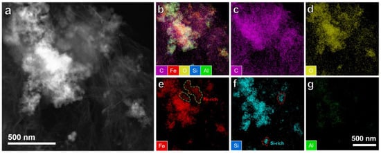 (a) STEM image. (b–g) Elemental mapping of BM-SFG: (c) C, (d) O, (e) Fe, (f) Si, (g) Al.