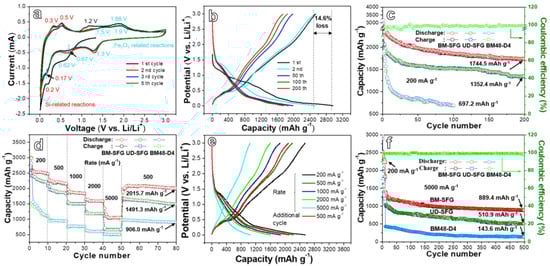 where Ctheoretical represents the theoretical capacity of the composite, and CSi, CFe2O3, and CrGO represent the theoretical capacity of Si, Fe2O3, and rGO, respectively. Figure 4c shows the cycling performance of BM-SFG, UD-SFG, and BM48-D4 cycling at 200 mA g−1. The specific capacity of these samples decreases rapidly in the first 10 cycles and declines at a slower rate in the subsequent cycles. The first discharge/charge capacities of the BM-SFG, UD-SFG, and BM48-D4 electrodes are 2967.5/2534.8, 2893.4/2093.5, and 3167.5/2234.8 mAh g−1, respectively. The initial coulomb efficiency of BM-SFG electrode (85.4%) is higher than that of the UD-SFG (71.4%) and BM48-D4 (70.6%) electrodes. The formation of SEI film leads to the irreversible loss of capacity and consumes part of Li+ to form inert lithium. After 200 cycles, the reversible capacities of the BM-SFG, UD-SFG, and BM48-D4 electrodes are 1744.5 mAhg−1, 1352.4 mAhg−1, and 697.2 mAhg−1 (100th cycle), respectively. It can be clearly seen that the BM-SFG electrode shows the highest coulomb efficiency, the best capacity retention, and cycle stability, demonstrating the best comprehensive performance among the tested materials. According to the mass ratio of the active materials, active Si, Fe2O3, and rGO contribute 70.1%, 16.1%, and 13.8%, respectively, towards the battery performance of the BM-SFG.