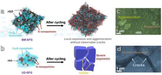 (a,b) Schematic illustration of the structural evolution before and after cycling: (a) BM-SFG, (b) UD-SFG. SEM images of the experimental anodes after cycling for 200 cycles at 200 mAg−1: (c) BM-SFG, (d) UD-SFG.