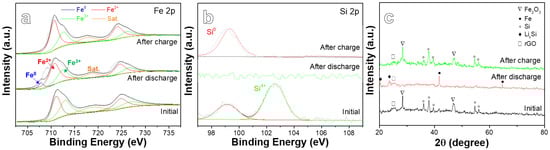 Figure 6a,b present an ex-situ XPS spectra analysis of the BM-SFG electrodes at different stages. As shown in Figure 6a, the Fe 2p spectra change significantly after the first discharge. A new peak appears at about 707.9 eV, which is related to the formation of Fe0. This fully shows that Fe2O3 participates in the lithium storage reaction in the charging/discharging process. After the charge, the XPS peak position is restored to the initial position of the material, indicating that the electrode has undergone an effective reversible reaction. As shown in Figure 6b, after the first discharge the peak corresponding to Si 2p becomes weak, which can be attributed to the formation of multi-component mixtures composed of different LixSi products that weaken the XPS signal of a single component, indicating that the alloying reaction between Si and Li took place during the cycling. After charging, only the peak of Si0 can be found, corresponding to the delithiation reaction of LixSi to Si. Figure 6c presents ex situ XRD results of the BM-SFG electrodes at different stages. After the first discharge, the main peak intensity of Si is markedly lower than that of the original material. LixSi peaks appear at 20.2° and 23.5°, while Fe peaks appear at about 42.5° and 65°, in accordance with the lithiation of Si to LixSi and the reduction of Fe3+ to Fe, respectively. After charging, the XRD peak position is returned to the initial position of the material, demonstrating a good reversibility of the materials.
