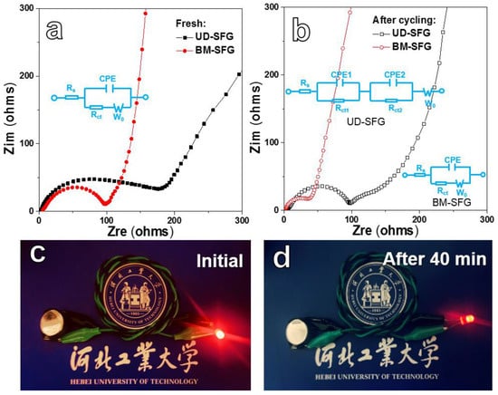 Nyquist plots for BM-SFG and UD-SFG electrodes: Fresh (a) and after 100 cycles (b). Digital photographs of a red LED bulb propelled by the BM-SFG battery: Initial (c) and after 40 min (d).