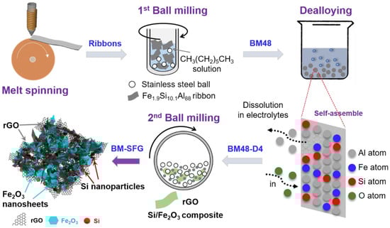 The typical preparation route of the target product is shown in Figure 8. The Fe1.9Si10.1Al88 ingots were firstly fabricated by our previously reported method [] through the arc-melting of Al ingots and the ferrosilicon ore (27.15 wt% Fe, 0.49 wt%-associated elements including Mn, S, P, and C, and Si balance) directly. The ingots were re-melted and produced into ribbons by the melt-spinning method [,,] and then were ball-milled (first ball-milling) into powders with a rotation speed of 600 r/min at room temperature for 48 h with ball-to-ribbon ratio of 60:1 (120 g grinding balls, 2.0 g ribbons). To inhibit samples from oxidation during ball-milling, the ribbons were immersed into n-heptane in the tank. The as-obtained powders were washed with absolute ethyl alcohol to remove antioxidants and dealloyed [,,] in 1.25 M NaOH solution for 4 h. After washing in anhydrous ethanol and drying in vacuum oven at 60 °C for 12 h, the dealloyed material (BM48-D4) was synthesized. Then, the BM48-D4 material was mixed with rGO in accordance with the mass ratio of 5:1 and ball milled (second ball-milling) for 10 min under the same milling conditions. After cleaning, the ball-milled Si/Fe2O3/rGO (BM-SFG) composite was obtained by drying at 60 °C for 12 h under vacuum conditions. For a comparison, the BM48-D4 material and rGO (mass ratio, 5:1) were mixed in the anhydrous ethanol with ultrasonic processing. Thus, the ultrasonic-treated Si/Fe2O3/rGO (UD-SFG) contrast sample was prepared after vacuum drying. The mass loading of the electrode materials was approximately 1.0~1.2 mg cm−2. Experimental details in material characterization and electrochemical measurements can be found in the Supporting Information S0.