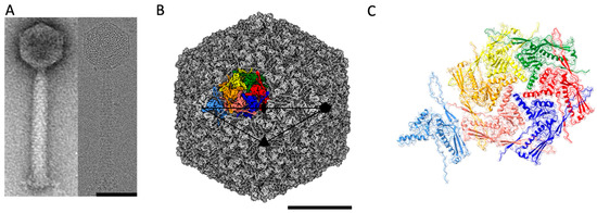 - Huet, A.; Duda, R.L.; Boulanger, P.; Conway, J.F. Capsid Expansion of Bacteriophage T5 Revealed by High Resolution Cryoelectron Microscopy. Proc. Natl. Acad. Sci. USA 2019, 116, 21037–21046. [Google Scholar] [CrossRef] [PubMed] [Green Version]