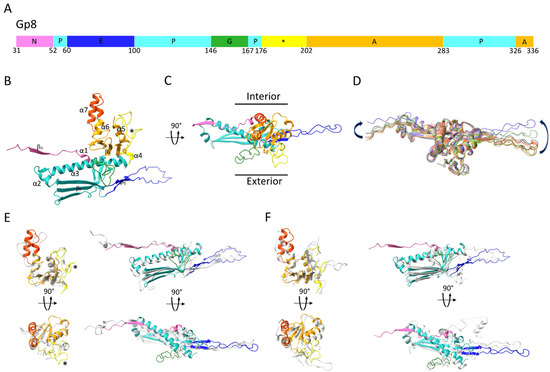 The ϕRSA1’s P domain is composed of two consecutive α helices (α2 and 3) and a three stranded β sheet (βP). The longest “spine” helix (α3) is interrupted near its end by a long (22 residues in length) G-loop (Figure 2A–C). Such long insertion in the spine helix has been previously described in other bacteriophages [21], as well as in some archeal viruses [38,39] where it was shown that the longer G-loop was important to lock the E-loop in position. The fold of the ϕRSA1’s MCP is strongly similar to the one of the satellite bacteriophage P4 of E. coli (PDB 7JW1 [40], 56% identity of sequence) (Figure 2F). The structural similarities are striking for the A and P domains (including the G-loop), while the N domain and E loop are completely different as the structure of the P4’s MCP is from a procapsid form, a different assembly intermediate than the mature capsid’s form of ϕRSA1. And it has been shown for several bacteriophages that the major differences between the procapsid and the mature MCP’s folds are located in the N domain and the E-loop. Indeed, during the procapsid to mature capsid transition, the capsid shell is switching from a more spherical form to a more angular one which require extensive rearrangements [41].