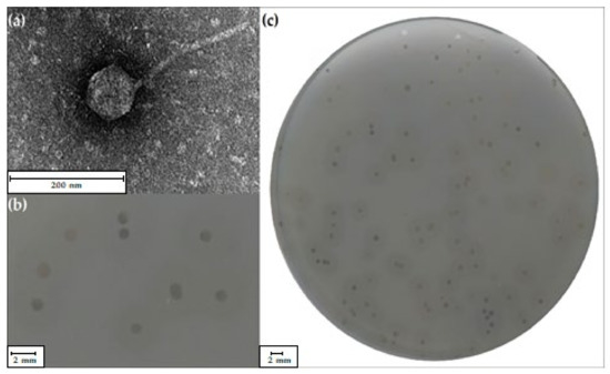 Characteristics of the virion (a) and plaques (b,c) of vB_SspS_KASIA. The scale bar in the transmission electron microscopy (TEM) image represents 200 nm. The scale bar in (b) and (c) images represents 2 mm.