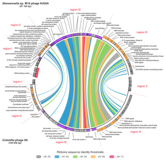 Comparison of the KASIA phage with Colwellia phage 9A. The similarities were based on all-against-all blastp searches, and are reflected by the ribbons connecting the ideograms. Their colors reflect the scale of the similarity between the encoded proteins, as indicated in the legend. The anchors of the ribbons correspond to the location of the protein-coding genes.
