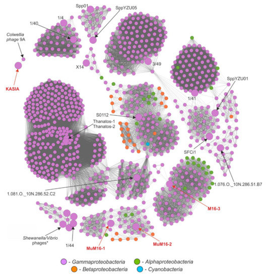 In order to better understand the diversity and relationships among phages infecting Shewanella spp., protein-sharing networks were generated with vConTACT v2 [88]. For this analysis, we also included three complete Shewanella sp. M16 prophages. From the 14,470 phage-predicted proteomes, we extracted a subnetwork of Shewanella-infecting phages and their relatives. These included the KASIA phage, three prophages from the M16 strain, and other Shewanella-infecting phages, as well as a set of viruses connected with them via edges. This resulted in a final network of 23 Shewanella (pro)phages and 892 other phages, connected by 38,709 edges in total (Figure 3 and Figure S11).
