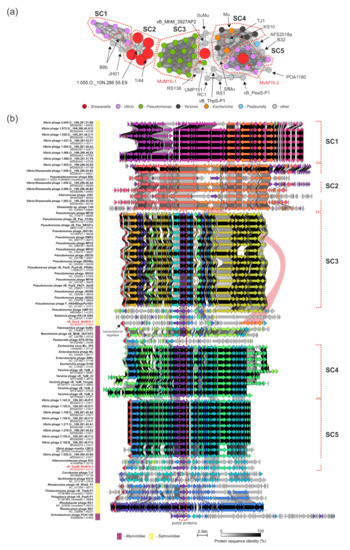 The majority of the clusters were composed of phages belonging exclusively to one phage family: Myoviridae, Siphoviridae, Chaseviridae, or Podoviridae (Figure S11c). These were further divided into lower taxonomic ranks (Figure S11d). However, there were phages encoding proteins which are similar to more than one phage family, acting as so-called bridges between two groups of phages. One of the clusters included three Shewanella phages: 1/44, MuM16–1, and MuM16–2. Within this particular cluster, one can distinguish five subclusters (SC1–5) of more closely related phages (a greater thickness of edges connecting the nodes) and several outliers, which are also partially reflected by the fact of infecting the same genus of bacteria, e.g., phages infecting Vibrio (magenta) and Pseudomonas (green) (Figure 4a). The SC1 and SC2 subclusters were composed of Siphoviridae phages. Among them, there were Shewanella 1/44, Alteromonas JH01, Pseudoalteromonas B8b, and viruses isolated from environmental samples (the Nahant Collection), with Vibrio and Shewanella strains as hosts [19]. Those from SC2—i.e., Shewanella phage 1/44, Vibrio phage 1.055.O._10N.286.55.E9, and Shewanella/Vibrio phages 1.049.O._10N.286.54.B5, 1.050.O._10N.286.48.A6, 1.083.O._10N.286.52.B9, and 2.096.O._10N.286.48.B5—encoded proteins that were similar to the structural proteins of the MuM16–1 prophage (Figure 4b). In particular, there were five (out of 17) structural protein products of adjacent genes of that phage, i.e., p45–p49. The mass spectrometry analysis of the MuM16–1 virions (see above) revealed that p45, p46, and p48 were present in its particles, possibly as parts of tails. Additionally, the applied machine-learning-based classification of these structural proteins using PhANNs [89] allowed us to hypothesize that p47 is a head–tail-joining protein (81% confidence), while p48 is a shaft or tail tube protein (100% confidence). Because MuM16–1 is a siphovirus, and because we observed a conserved synteny of structural genes among SC2 members infecting Shewanella strains, we hypothesize that the whole set of five conserved genes might be involved in the recognition of the bacterial surface receptors required for the successful infection of a cell. It is also worth noting that the products of these five genes are, in fact, the only ones that allow for connecting Mu-like phages with the SC2 and, through it, also the SC1 subclusters of non-Mu-like Siphoviridae phages. MuM16–1 acts here as a so-called “bridge” between these two groups of viruses.
