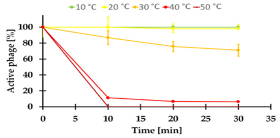 The viability of the KASIA phage at a temperature range of 10–50 °C was investigated. The virus was sensitive to temperatures ≥ 40 °C, with an immediate loss of infectivity at 50 °C (Figure 5). A similarly limited tolerance to higher temperatures was previously demonstrated for the temperate Serratia phage BZS1 isolated from the same environment, but from rock biofilms [16]. However, the stable low temperature in this gold mine (10–11 °C) [9,10] is probably sufficient for the propagation and survival of these viruses.