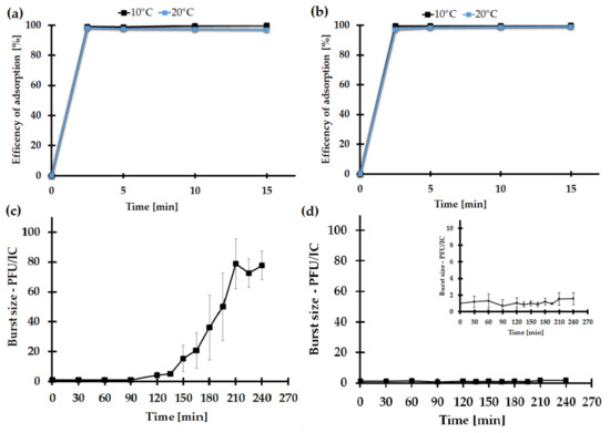 As LB is a nutritionally rich medium, and because its components (or the products of bacterial metabolism in this medium) could potentially limit the adsorption efficiency of the phage, we studied the kinetics of KASIA adsorption to Shewanella sp. M16 cells in LB and R2A media. This revealed KASIA phage rapid cell adsorption in both media, at 10 °C and 20 °C. After 2.5 min incubation, approximately 99% of the phages were attached to the host cells, and the attachment efficiency of KASIA was stable during the whole experiment (Figure 6a,b). Therefore, we concluded that there were probably no factors in the LB medium that interfered with phage adsorption to M16 cells.