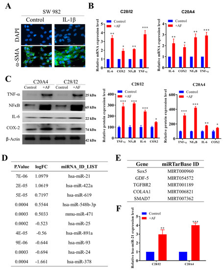We first simulated the arthritic synovial microenvironment by culturing a fibroblast-like SW982 synovial cell line with 10 ng/mL of pro-inflammatory cytokines, IL-1β for 24 h. The resultant SW982 cells (hereafter referred to as AF) showed markedly increased expression of α-SMA, a marker for activated fibroblast, compared with their unstimulated control counterparts (Figure 1A). Subsequently, human chondrocyte cell lines, C28/I2 and CA402, were cultured in the presence of AF, referred to as activated chondrocytes (AC). AF co-culture chondrocytes, i.e., in AC cells demonstrated significantly increased expression of inflammatory markers IL-6, NFκB, TNF-α, and Cox2 at the mRNA and protein levels (Figure 1B,C), suggesting a role for AF in promoting chronic inflammation. We then searched publicly available GEO (GSE37627) databases for candidate miR’s associated with dysfunctional fibroblasts, including activated fibroblasts. As indicated, miR-21, miR-422a, and miR-619 were found to be the top three miRs identified in dysfunctional fibroblasts (Figure 1D). Using an online miRTargetLink Human target search tool [33], we found that miR-21 targets genes that play key roles in different aspects of chondrogenesis, namely SOX5, GDF-5, TGFBR2, COL4A1, and SMAD7 (Figure 1E). Consistently, we found an elevated level of miR-21 in both C28/I2 and CA402 cells after AF induction (Figure 1F).