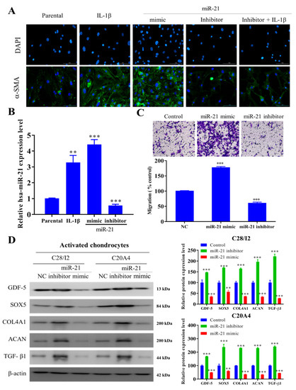 Next, we tested our hypothesis that miR-21 modulates the transformation of activated fibroblast-like SW982 (AFs) cells. We demonstrated that while incubation with IL-1β or miR-21 mimics promoted the AF trait of SW982 cells as demonstrated by increased α-SMA protein expression, treatment with the miR-21 inhibitor alone or in the presence of IL-1β markedly suppressed the expression of α-SMA protein (Figure 2A,B). Besides, SW982 cells bearing miR-21 mimic showed increased migratory ability while migration was significantly suppressed in their counterparts with the miR-21 inhibitor (Figure 2C). Furthermore, co-culturing with miR-21 inhibitor-treated AF-induced C28/I2 and C20A4 cells exhibited induced expression levels of chondrogenesis markers, namely GDF-5, SOX5, TGF-β1, COL4A1, and ACAN proteins in comparison with the miR-21 mimic and NC control cells (Figure 2D).