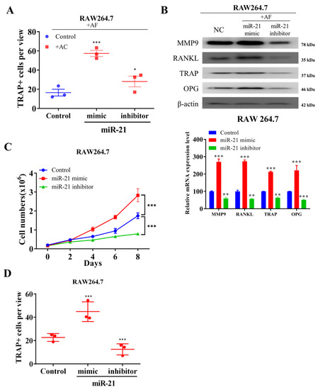 In the progressive development of OA, the balance between bone formation and resorption is significantly skewed towards the latter [34]. Our investigation of the effects of miR-21 overexpression in AFs on osteoblast differentiation showed that co-culture of RAW264.7 cells with the activated fibroblast-like SW982 chondrocytes pre-exposed to miR-21 mimic significantly increased the population of macrophage-lineage TRAP+ cells compared with their control or miR-21 inhibitor-exposed counterparts (Figure 3A), suggesting that ectopic expression of miR-21 promotes the osteoblast-mediated differentiation of osteoclast precursors to osteoclasts. The methods suggested by Lampiasi, Nadia et. al, 2021 [35] were applied in our study for osteoclasts differentiation from murine RAW264.7 cells stimulated by RANKL. Western blot analyses showed that compared with negative control (NC) or RAW264.7 cells co-cultured with miR-21 inhibitor-treated AFs, RAW264.7 cells co-cultured with miR-21 mimic pre-treated AFs showed upregulated expression of osteoclast differentiation markers, matrix metallopeptidase (MMP) 9, receptor activator of NFκB ligand (RANKL), triiodothyronine receptor auxiliary protein (TRAP), and osteoprotegerin (OPG) proteins (Figure 3B). Moreover, we demonstrated that co-culture with miR-21 mimic pre-treated AFs significantly enhanced the proliferation of RAW264.7 cells compared with their counterparts in the control group or co-cultured with miR-21 inhibitor-treated ACs (Figure 3C). Probing the cell-type independence of miR-21 effect, we observed that exposure of RAW264.7 cells to miR-21 mimic markedly increased the number of TRAP+ cells compared with the control or miR-21 inhibitor-treated group (Figure 3D), suggesting that the ectopic expression of miR-21 in RAW264.7 cells also enhances the tendency towards osteoclast differentiation.