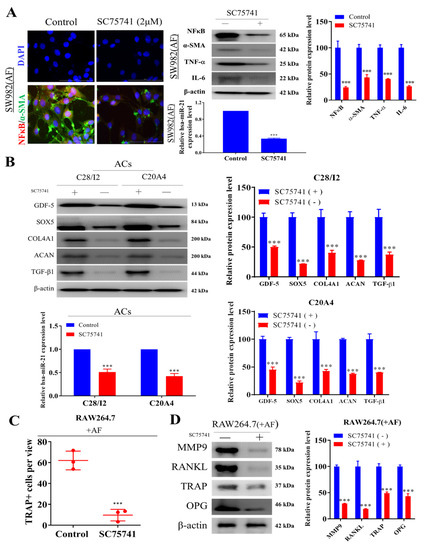 Effect of SC75741 a potent NFκB inhibitor on the transformation of activated fibroblasts, chondrocytes, and osteoclasts. (A) Representative immunofluorescence image demonstrating the effect of SC75741 on α-SMA and NFκB expression SW982 (AF) cells; qRT-PCR analysis of miR-21 expression and Western and bar blot analysis of expression of NFκB, α-SMA, TNFα, and IL-6 (at the protein level and normalized by the internal control β-actin) after SC75741 treatment. (B) Western and bar blot analysis of the expression of markers of human chondrocytes and qRT-PCR analysis of miR-21 expression in AC cells (C28/I2 and C20A4 chondrocytes). (C) TRAP staining of SC75741-treated AF cocultured with RAW264.7 cells. Quantification of multinucleated TRAP+ cells. (D) Protein analysis of the expression of osteoclast-specific genes in SC75741-treated SW982 cells (AF). Scale bar = 50 μm. *** p < 0.001.