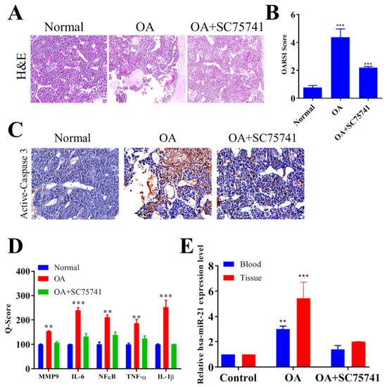 After demonstrating that the treatment with SC75741 resulted in reduced generation of activated chondrocytes, and osteoclasts in vitro, we evaluated its potential therapeutic effects in vivo using the rat OA model. The rat OA model was established by intra-articular injection of the proteolytic enzyme, papain, and the histopathological changes in the articular structure were assessed by hematoxylin and eosin (H&E) staining and Osteoarthritis Research Society International (OARSI) scores. In comparison with the control rats with normal joints, we observed marked destructive changes in the articular cartilage morphology of the papain-induced OA models, including cartilage erosion, proteoglycan accumulation, and cellular loss or denudation; this OA-associated articular destruction was markedly ameliorated by treatment with SC75741 (15 mg/kg) (Figure 5A). Importantly, the SC75741-induced reduction in the severity of OA cartilage destruction correlated with a significantly lower OARSI score (Figure 5B). This is consistent with immunohistochemical staining results that showed that SC75741 (15 mg/kg) treatment significantly downregulated the expression of active Caspase-3 protein, a marker of apoptosis in the rat articular cartilage compared with the untreated OA model or their normal counterparts (Figure 5C). Interestingly, as demonstrated by Q-score values, we observed that treatment with SC75741 also markedly reduced the protein expression of MMP9, IL-6, NFκB, TNF-α, and IL-1β (Figure 5D), as well as the plasma and tissue miR-21 expression level (Figure 5E) in comparison with the untreated OA group.