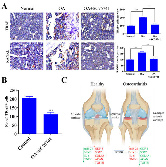 Treatment with SC75741 significantly downregulated the expression of TRAP and RANKL in the joints and cartilage of OA rats (Figure 6A). To assess the effect of SC75741 on RANKL induced chondroclast differentiation, the co-culture system was applied as suggested previously by Kwon, J.Y. et al. 2018 [40]. The bone marrow-derived monocytes (BMMs) were treated with SC75741 in the presence of M-CSF and RANKL for two weeks; we demonstrated that treatment with SC75741 significantly suppressed the formation of TRAP+ mature multinuclear chondroclasts (Figure 6B). SC75741-treatment results in the inhibition of NFκB circuit and suppressed miR-21 signaling in the activated chondrocytes, which conversely results in the upregulation of miR-21 predictive targets SOX5, TGF-β1, GDF-5, and COL4A1, (Figure 6C). Overall these results suggest that SC75741 has a significant inhibitory effect on RANKL-mediated chondroclast differentiation and activation.
