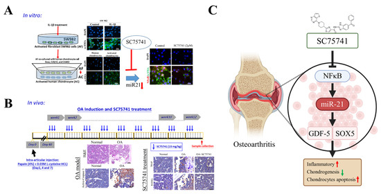 OA is characterized by synovial inflammation—specifically, significantly elevated inflammation in the NFκB circuit (involving NFκB, IL-6, and TNF-α) with miR-21. Synovial inflammation promotes the generation of activated chondrocytes (ACs); ACs further promote inflammation through increased miR-21 signaling; the reduced expression of the chondrogenesis inducers SOX5, TGF-β1, and GDF-5 and the reduced expression of the ECM markers COL4A1 and ACAN. SC75741-induced inhibition of the NFκB circuit suppresses miR-21 signaling in activated chondrocytes and conversely upregulates its targets SOX5, TGF-β1, GDF-5, and COL4A1, preventing further articular chondrocyte destruction and mitigating OA overall (Figure 7). Our study has some limitations. As the human healthy synoviocytes, cell line or primary synoviocytes and patients’ samples has not been included in this study, which could be the best choice for this kind of study.