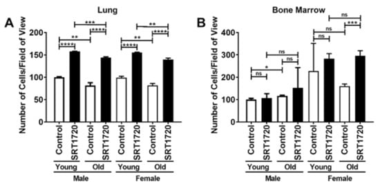 In order to begin to understand the role of SRT1720 treatment on EC function in aging, here, we examined bone marrow and lung ECs (BMECs and LECs, respectively) derived from young (3–4 month) and old (20–24 month) mice.