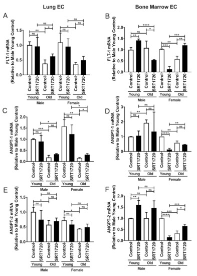 Real-time PCR analysis of ECs isolated from lungs (A,C,E) or bone marrow (B,D,F). Relative mRNA expression was measured for the following genes: fms-related tyrosine kinase-1 (FLT-1) (A,B), Angiopoietin 1 (ANGPT-1) (C,D), and Angiopoietin 2 (ANGPT-2) (E,F). Young male control (vehicle treated) expression was set to 1.0 and expression in all other samples are shown relative to the young male control. Data are expressed as the mean ± SD. An unpaired Student’s t-test was used to identify statistically significant differences. n = 3 mice/sex/age. ns = not significant, * p < 0.05, ** p < 0.01, *** p < 0.001, and **** p < 0.0001.