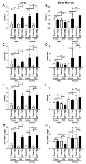 Angiogenesis parameters associated with ECs isolated from lungs (A,C,E,G) or bone marrow (B,D,F,H). The number of nodes (A,B), the number of meshes (C,D), the number of paths (vessel-like tubes) (E,F), and the total path length (G,H) were quantified. Young male control (vehicle treated) expression was set to 1.0 and expression in all other samples are shown relative to the young male control. Data are expressed as the mean ± SD. An unpaired Student’s t-test was used to identify statistically significant differences. n = 5 mice/sex/age. ns = not significant, * p < 0.05, ** p < 0.01, and *** p < 0.001.