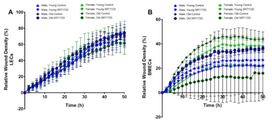 Additionally, endothelial function was further examined in terms of migration potential. Surprisingly, no differences were observed between young or old, male, or female LECs treated with or without SRT1720. However, SRT1720 treatment did not appear to impact migration in young or old male BMECs; but inhibited migration in both young and old female BMECs. Our findings appear to be in conflict with the findings of Potente et al., which showed that SIRT1 knockdown blocked murine EC migration whereas over expression of wild type SIRT1 increased migratory activity of ECs [19]. While more work is required to fully understand these conflicting results, it is feasible that the use of different populations of ECs could be responsible for these conflicting findings.