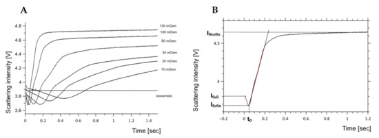 where A stands for the vesicle surface area, P for the water membrane permeability, Vw for the molar volume of water (Vw = 0.018L/mol), and Δπ for the osmotic pressure difference across the membrane. In such case, according to Equation (1), the water flux should remain constant in time, meaning that the dependence of the vesicle volume on time should follow the straight line with the slope proportional to the product of the salt concentration outside the vesicle and the membrane permeability coefficient [47]. Examples of experimental kinetic curves collected for egg-PC liposomes exposed to different osmotic pressure differences are presented in Figure 1A. All curves have a complex character, contrary to the prediction of the simplistic model represented by Equation (1). The intensity of the light scattered by vesicle suspension depends on the number of liposomes present in the optical path, liposome size distribution and optical properties of three distinct regions: outer aqueous phase, lipid bilayer and the inner aqueous phase. The light is scattered most effectively at the interfaces separating aqueous phases from hydrophobic core of the lipid bilayer [48]. During the stopped-flow experiment, when lipid suspension is mixed with the solution-containing compound of interest, the outer aqueous phase is instantaneously changed followed by alteration of the adjacent surface of the lipid bilayer. The mixing of the vesicle suspension with the concentrated solution will last for a few milliseconds and overlaps with dead time of the instrument. Therefore, the initial decrease of the scattered light intensity reflects changes in the restructuring (reorganization) of the outer interface of the lipid bilayer (Figure 1B). The minimal value of the scattered light intensity (I0,fin) following mixing corresponds to the situation where two interfaces of the lipid bilayer are exposed to different aqueous solutions and the vesicle volume is not yet altered. Next, the liposome suspension will progress towards the equilibrium state, in which the osmotic pressures difference will be balanced by the membrane resilience to deformation. The progress of the vesicle suspension, containing exclusively osmotically active compounds, towards the equilibration is possible only thanks to the osmotically driven water flux. The final level of the scattered light intensity (Ifin,fin) will reflect the final equilibrium reached by the liposome suspension.