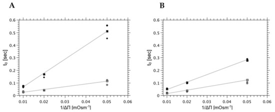 Equation (2) accounts for the two-stage kinetics of the osmotically driven scattered light intensity change. The kinetic curve can be parameterized using two arbitrary selected quantities: the time when the deflection point occurs (t0), and the rate of liposome volume change reflecting water outflow. The suspension of vesicles exposed to the osmotic pressure difference can be also analyzed using equilibrium quantities; the relative scattered light intensity associated with the alterations of lipid bilayer interfaces (I0,fin and Ifin,fin) as presented in Figure 1B. The deflection point can be correlated with the outer interphase reorganization, caused by the appearance of the osmotically active compound (salt or sucrose) followed by the membrane topological alteration leading to the lipid pore formation. Consequently, the delay time of the deflection point (t0) depends on the membrane resilience to reorganization and is proportional to 1/Δπ (Figure 2). The position of the deflection point (t0) is influenced mainly by the lipid bilayer dynamics, which is affected by thermal conditions of the sample and by the composition of the lipid bilayer. Figure 2 shows the dependence of time required to reach deflection state on the temperature for two different membrane compositions (left panel (A)—egg-PC liposomes and right panel (B)—egg-PC/lysoPC, 85:15, liposomes) where the water outflow was induced by KCl (-●-), NaCl (-■-) or sucrose (-◆-) concentration gradients.