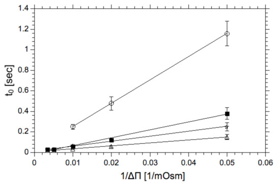 Presented data shows that the membrane reorganization time, following the osmotic compound addition, decreases at the elevated temperature. This result can be easily explained by the increased mobility of lipids in the membrane (material softening). The other observation is that at 15 °C the lipid bilayer containing lyso-lipids (15 mol%) equilibrates much faster than membranes formed from egg-PC alone. The difference is less prominent at higher temperature (40 °C) where, in both cases, molecular mobilities are equally high with a high propensity to form surfaces with positive spontaneous curvatures, therefore, enhancing the plasticity of the lipid bilayer [53]. The dependence of the position of the deflection point on the osmotic pressure difference is presented here for the first time and demonstrates that osmotic imbalances between membrane interfaces induced its structural instability, which may lead to pore formation and enhanced water permeability. Interestingly, the position of the deflection point does not depend on the compound used for the generation of the osmotic pressure difference, showing that the membrane reorganization is not caused by the solute but rather on reduced water activity in concentrated solutions [54]. The osmotic imbalance, as shown in Figure 3, affects the lipid bilayer dynamics (the dependence of t0 on 1/Δπ) regardless on its lipid composition, albeit to a different degree. In all cases rising osmotic pressure difference reduces the value of parameter t0. As expected, the membrane containing 30 mol% of cholesterol reduces the molecular mobility of lipid molecules (membrane softness) as demonstrated by elevated t0 values. This result is in good agreement with data presented by others that the cholesterol stabilizes the structure of the lipid bilayer hence reducing the lipid bilayer permeability [55,56]. This result is consistent with the observations presented in the literature about lyso-lipids. Compounds capable of destabilizing the structure of the lipid bilayer should have the opposite effect. Both lyso-lipid and phosphatidylethanolamine (PE) change lipid organization, enhancing the propensity for the lipid pores formation [33,41,57].